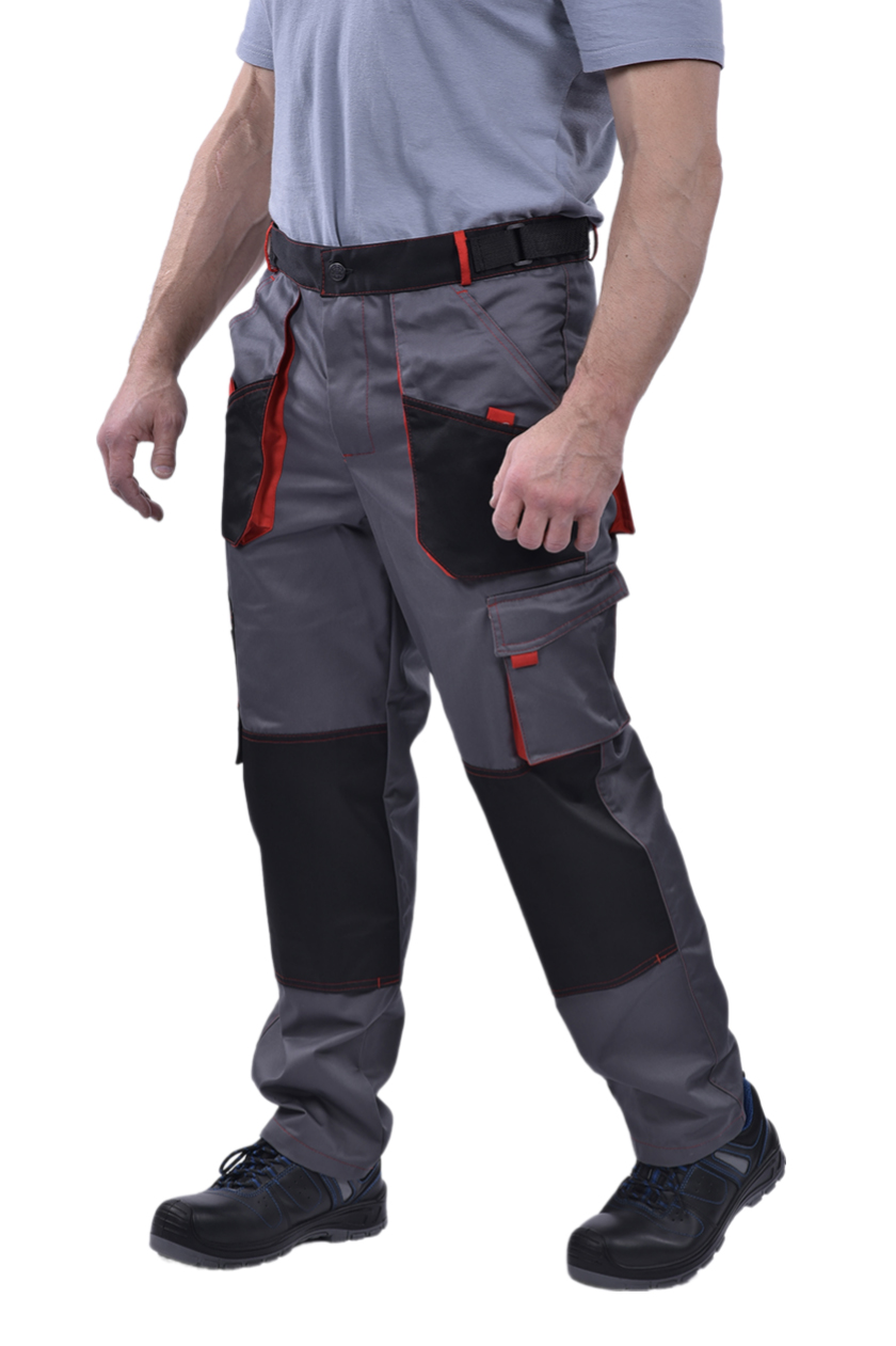 Брюки мужские с застежкой гульфика на тесьму «молния» и притачным поясом с красными шлевками. Передние половинки брюк с 2 боковыми накладными карманами с наклонным входом. На левой половинке в области колена дополнительный карман.
