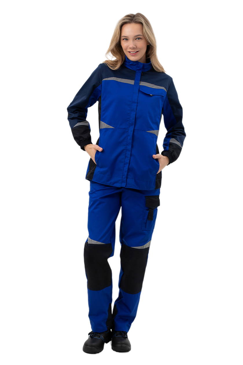 ➠ Брюки с застежкой на молнию, с притачным поясом, стянутым резинкой в области боковых швов для лучшей посадки на фигуре, пояс со шлёвками. Застежка пояса на пуговицу. Брюки с боковыми карманами с наклонной линией входа, с наколенниками и усилениями по шаговому шву. На задней половинке брюк фигурный накладной карман. На боковом шве брюк расположен накладной многофункциональный карман с фигурным клапаном и застежкой на липучку. Костюм со светоотражающими фигурными полосами для лучшей видимости в темное время суток.