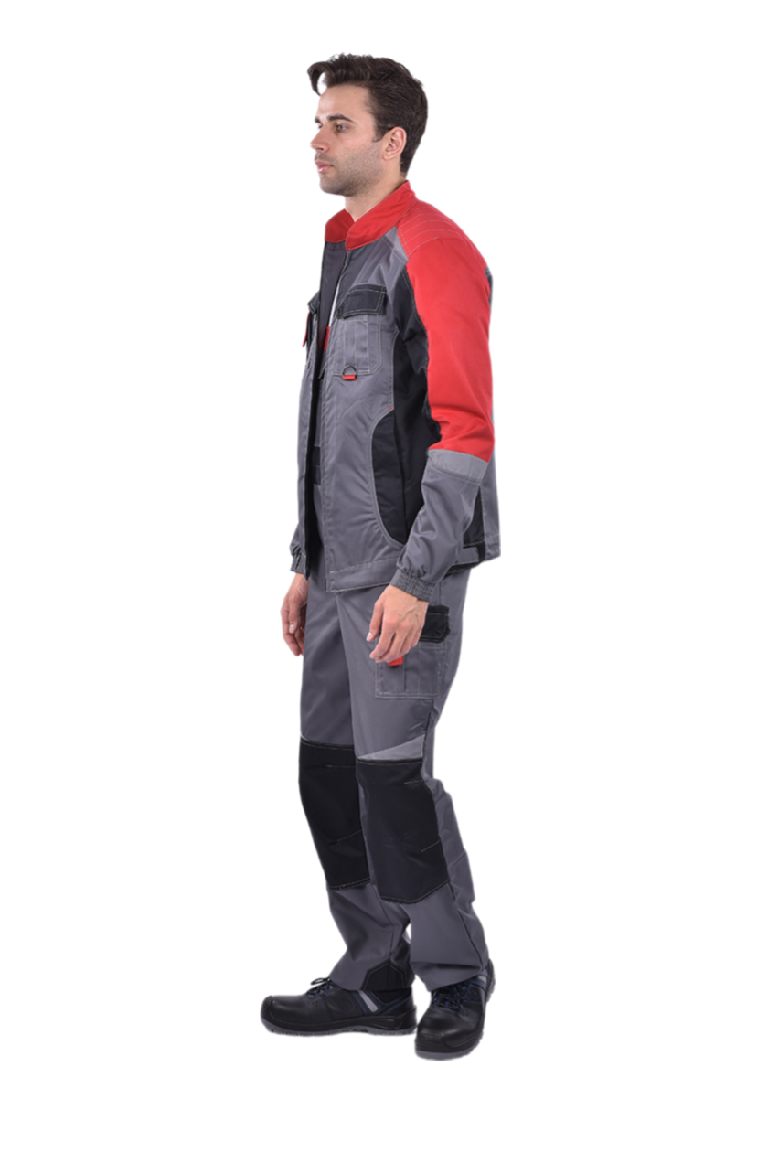 ➠ Куртка: цвет серый с красной и черной отделкой, силуэт прямой, пояс притачной, застежка на молнию, воротник стойка. Накладные карманы комбинированные с малыми накладными карманами с разделителями. Прорезные карманы на нижней части полочки. По шву притачивания кокетки вверху и по рукавам фигурные вставки СОП.