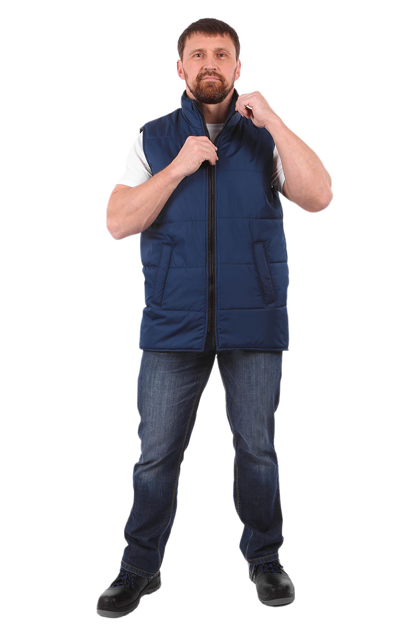 Жилет прямого силуэта, с центральной застежкой на тесьму «молния». Два нижних прорезных кармана с наклонным входом.